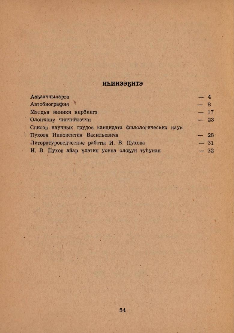 Иннокентий Васильевич Пухов (1904 - 1979) / [Уус-Алдан улууһун дьаһалтата, В. А. Протодьяконов-Кулантай аатынан литературнай комплекс ; хомуйан оҥордулар, бэчээккэ бэлэмнээтилэр, корректуратын аахтылар: З. В. Мигалкина, И. В. Мигалкин]. - Бороҕон : [и. с.], 1994. - 34 с.