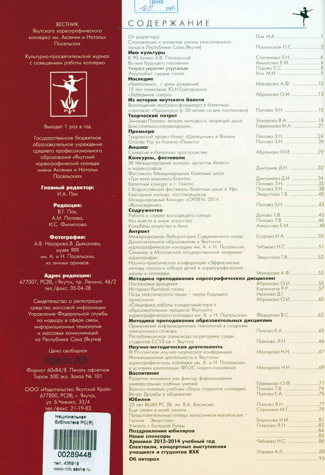 - Периодические издания Якутии (конец XIX – XXI вв.) > Журналы > Вестник Республиканского хореографического училища им. А. В. Посельской,