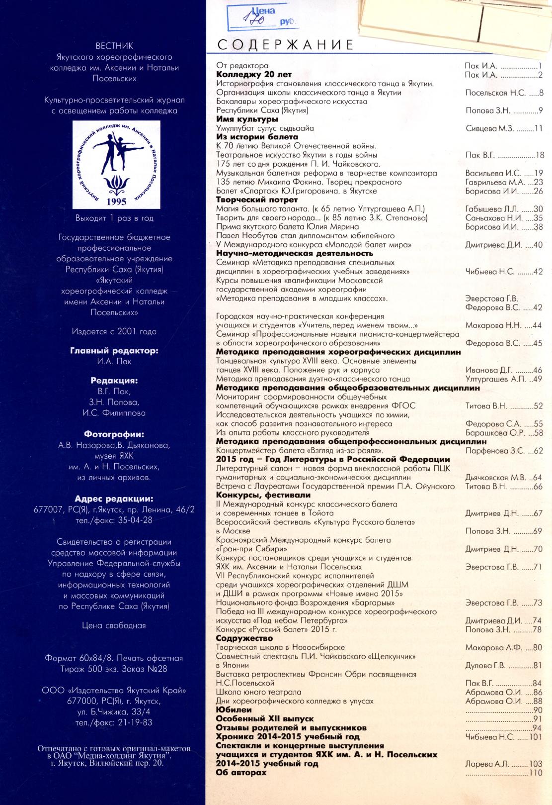 Вестник Якутского хореографического колледжа им. Аксении и Натальи Посельских: культурно-просветительский журнал с освещением работы училища