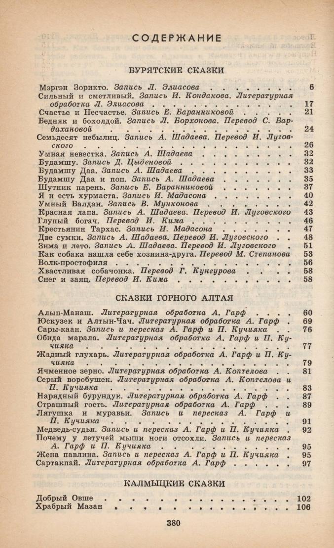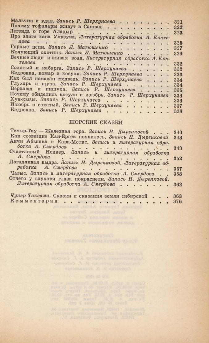 Сказание о просторе : cказки народов Бурятии, Горного Алтая, Калмыкии, Тувы, Хакасии, Якутии и малых народов Сибири - долган, тофаларов и шорцев / cоставитель, автор послесловия и комментарии Ч. М. Таксами. - Ленинград : Лениздат, 1988. - 383 с.