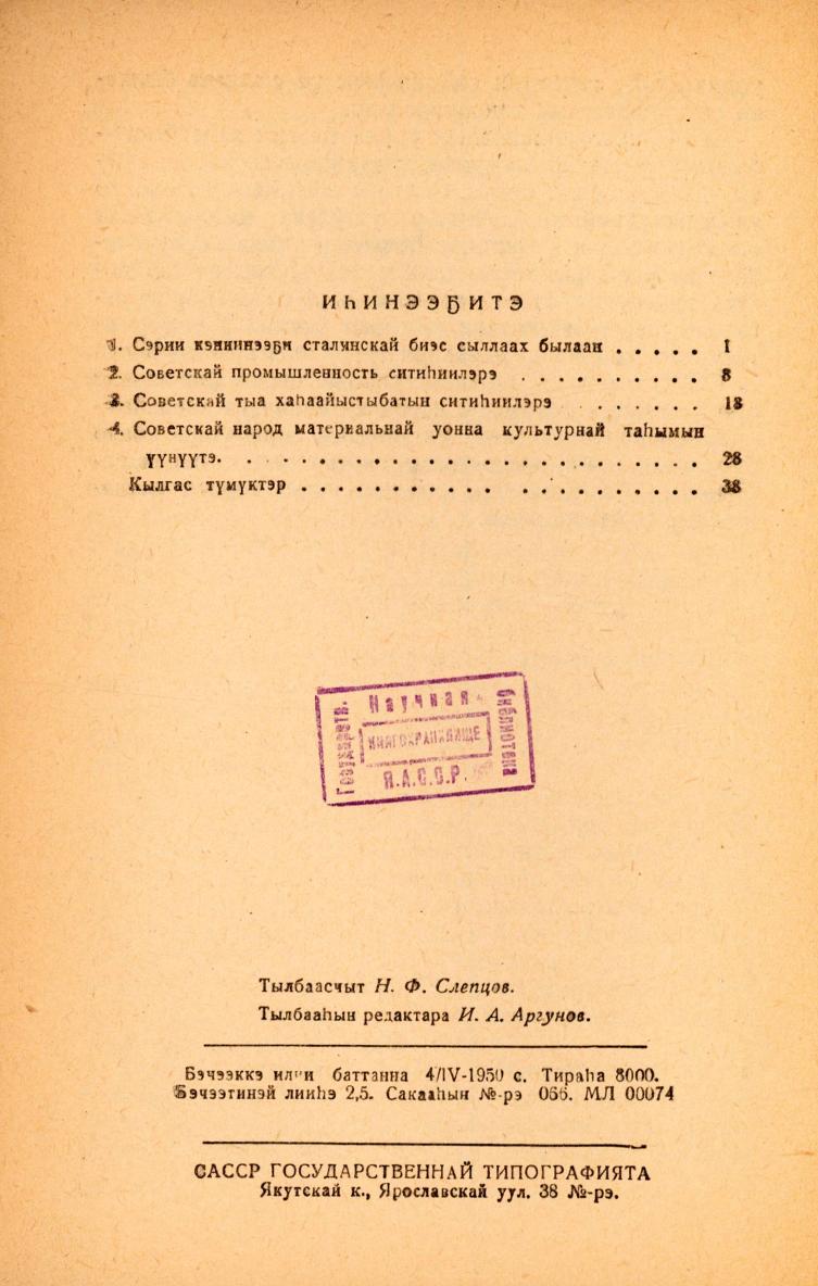 Советскай народ ССРС народнай хаһаайыстыбатын чөлүгэр түһэрэр уонна сайыннарар иһин охсуһууга : 12-с темаҕа матырыйааллар : 1949-50 сс. үөрэх дьыла / [тылб. Н. Ф. Слепцов]. - Якутскай : САССР Госиздата, 1950. - 38, [2] с.