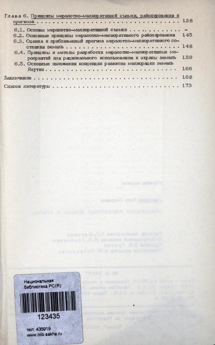 Мелиорация мерзлотных земель в Якутии / П. П. Гаврильев ; ответственный редактор М. К. Гаврилова ; Академия наук СССР, Сибирское отделение, Институт мерзлотоведения. - Новосибирск : Наука. Сибирское отделение, 1991. - 180 с.