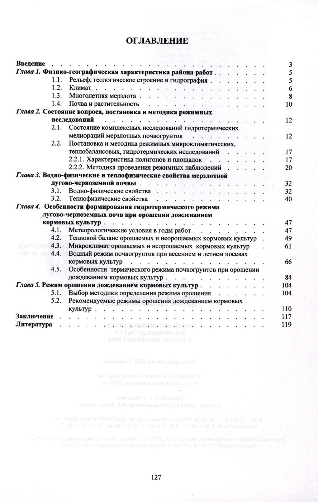 Приводятся мерзлотно-климатические условия формирования водно- теплового режима мерлотных лугово-черноземных почв Центральной Якутии. Рассматривается структура радиционного баланса и микроклимат неорошаемых и орошаемых кормовых культур. Установлено различие структуры теплового баланса весеннего и летнего посевов кормовых культур.Рекомендуется рациональный режим дождевального орошения кормовых культур, исключающий развитие негативных криогенных процессов и явлений при близком залегании повторно-жильных льдов