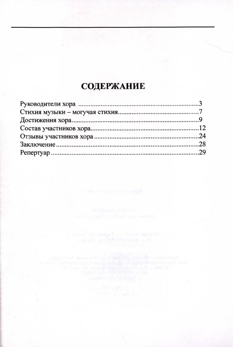 В данном сборнике представлены руководители хора и концертмейстеры, чей труд должен стать примером для многих учебных и самостоятельных хоровых коллективов. В приложении к сборнику включен нотный репертуар наиболее значительных произведений, которые исполнялись в разные годы. Дается состав участников хора, начиная с 1998-1999 гг. в течение 15 лет со дня создания хора. Интересным являются страницы отзывов и воспоминаний выпускников и участников хора о работе коллектива