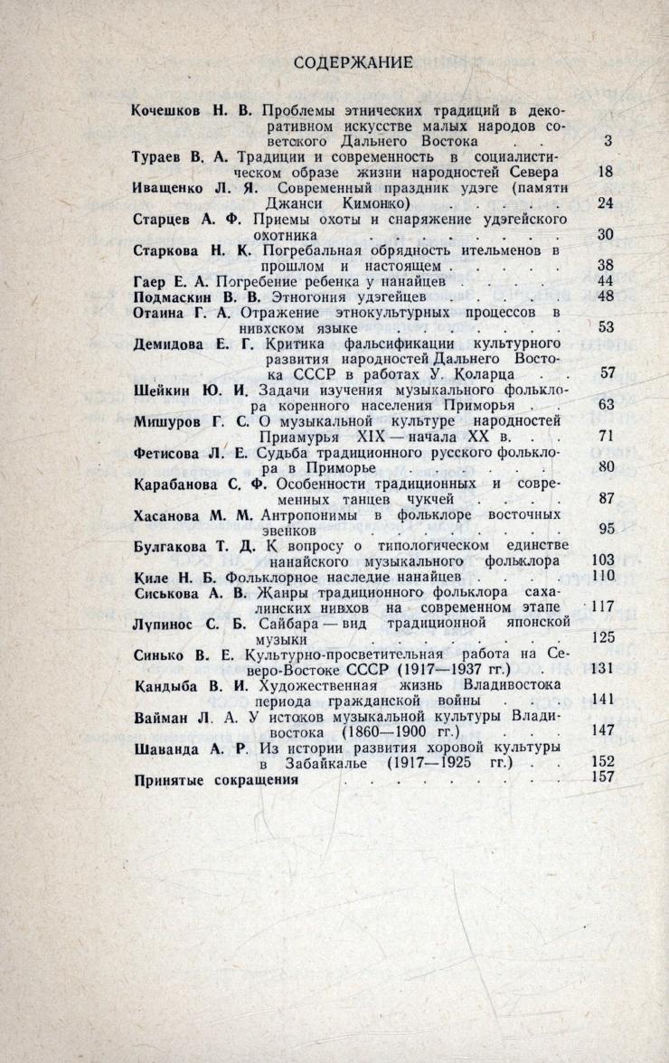 Сборник представляет собой первый опыт совместного научного сотрудничества Института истории, археологии и этнографии народов Дальнего Востока ДВНЦ АН СССР и Дальневосточного педагогического института искусств в области исследования традиционной культуры, ее особенностей, соотношения с современностью. Авторы рассматривают вопросы традиционной материальной и духовной культуры, современного состояния художественного творчества дальневосточных народностей, становления и развития профессионального искусства в регионе