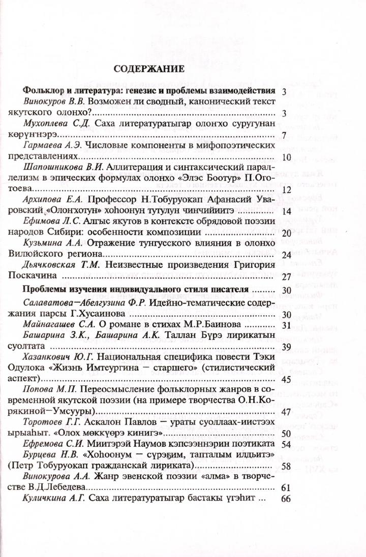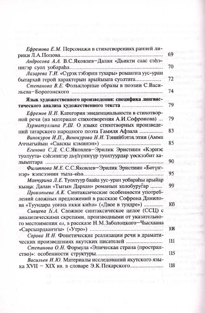 Проблемы литератур народов Сибири: национальное своеобразие, тюркское стихосложение, традиции и новаторство : материалы Всероссийской научной конференции : к 75-летию доктора филологических наук, профессора, заслуженного деятеля науки Республики Саха (Якутия) Тобурокова Николая Николаевича / [составители: С. Е. Ноева, кандидат филологических наук, В. Е. Степанова ; редакционная коллегия: Т. Н. Васильева, кандидат филологических наук, Л. Н. Романова, кандидат филологических наук]. - Якутск : Издательство ЯГУ, 2009. - Ч. 2. - 2009. - 120, [2] с.
