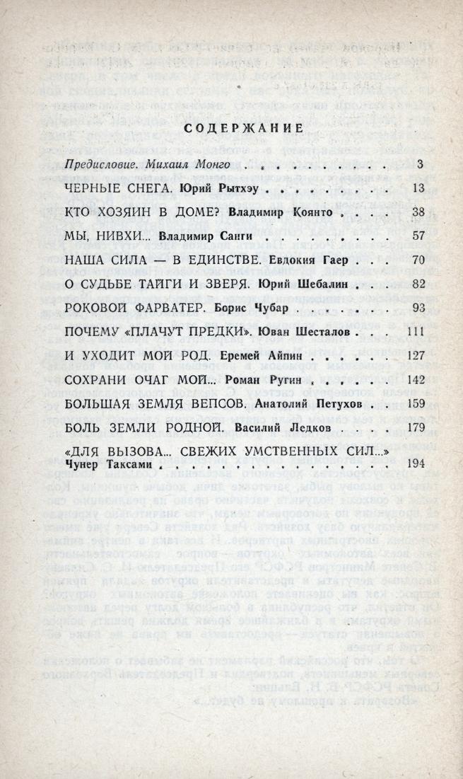 Выть ли малочисленным народам Севера, национальная самобытность, язык и культура которых не выдерживает «натиска цивилизации»? Можно ли сохранить богатства родной земли, многовековые обычаи предков, этнические особенности рода, подняв уровень жизни, образования, медицины? И что такое промышленное освоение северных окраин России для местного населения — беда или благо?! Эти и другие не менее острые вопросы поднимают авторы сборника, размышляя о вчерашнем, сегодняшнем и завтрашнем дне малочисленных народов Севера