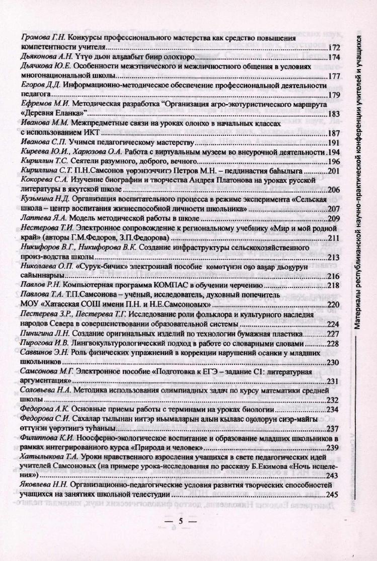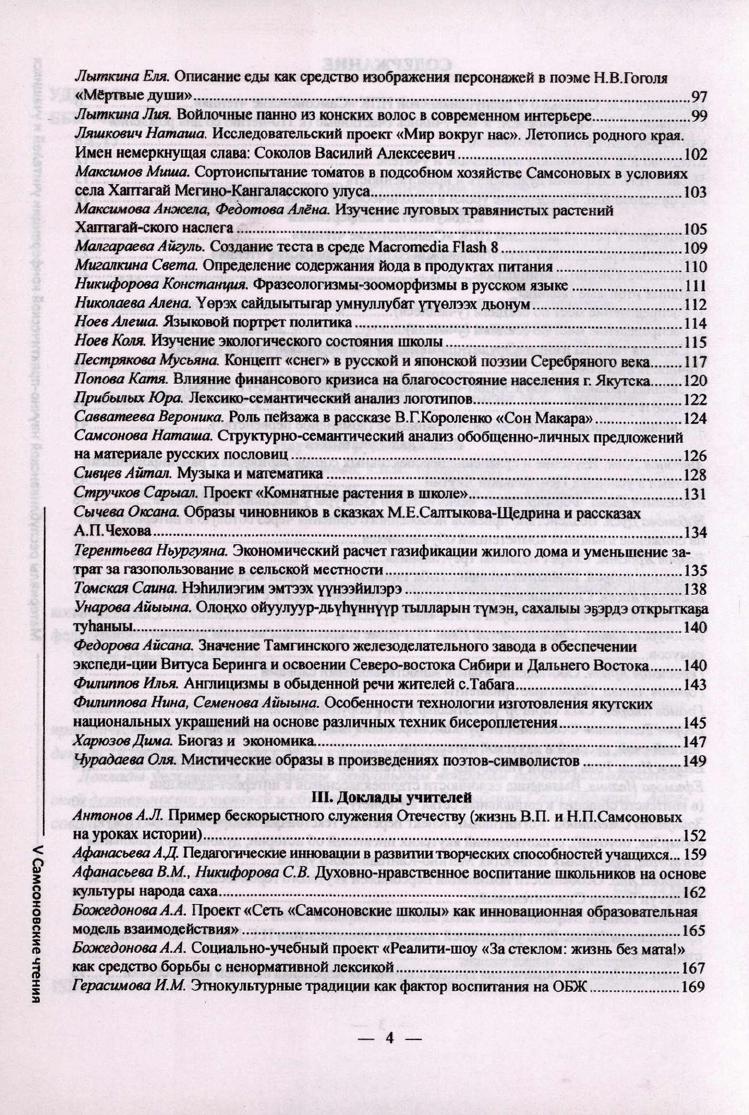 V Самсоновские чтения : материалы республиканской научно-практической конференции учителей и учащихся / [редколлегия: Р. М. Терентьев (ответственный редактор), М. Г. Самсонова, А. П. Олесова, кандидат педагогических наук ; научный руководитель Т. П. Самсонова, кандидат педагогических наук, профессор]. - Якутск : ИПК СВФУ, 2011. - 248 с. : ил. ).