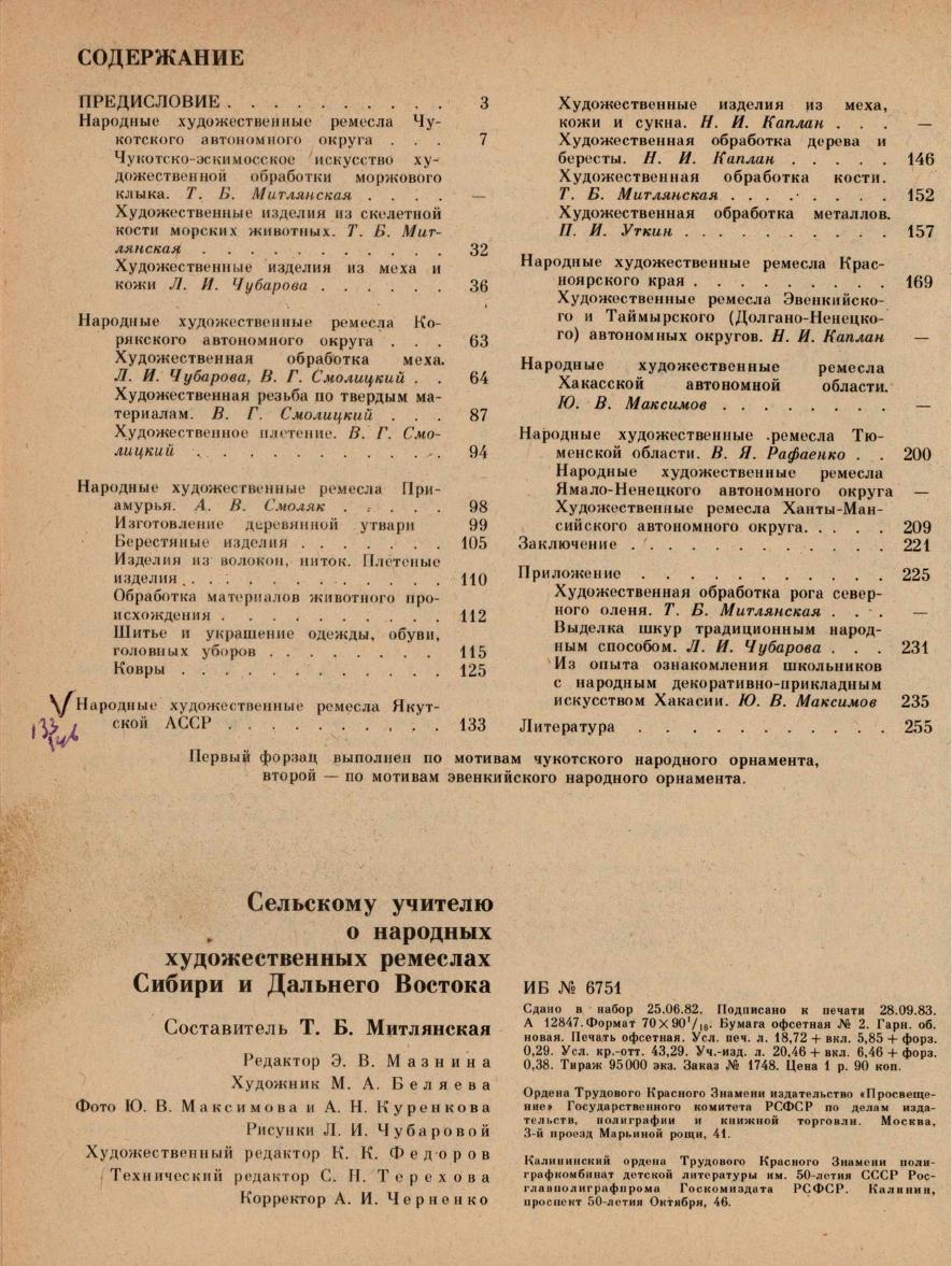 Сельскому учителю о народных художественных ремеслах Сибири и Дальнего Востока : книга для учителя / [Т. Б. Митлянская, Л. И. Чубарова, В. Г. Смолицкий и др.] ; сост. Т. Б. Митлянская. - Москва : Просвещение, 1983. - 256 с., [40] отд. л. цв. ил.
