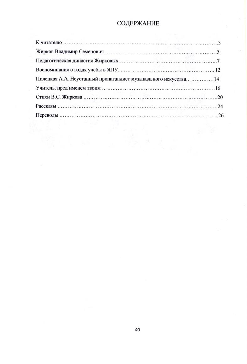 Брошюра посвящена педагогической и творческой деятельности заслуженного работника образования Республик Саха (Якутия), отличника народного просвещения РСФСР, отличнику Всероссийского хорового общества, почетному члену Всероссийского музыкального общества, преподавателю музыкального отделения Якутского педагогического колледжа им. С.Ф. Гоголева Владимиру Семеновичу Жиркову