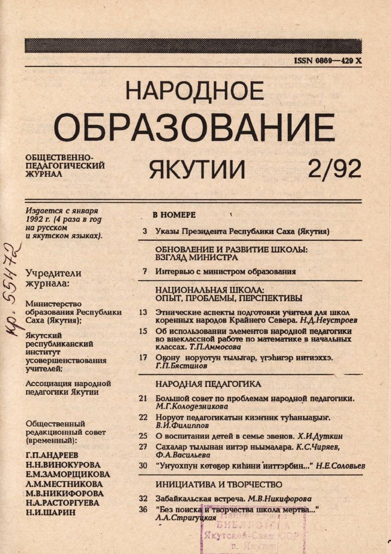 Народное образование Якутии : общественно-педагогический журнал. - Якутск : Сахаполиграфиздат, 1992