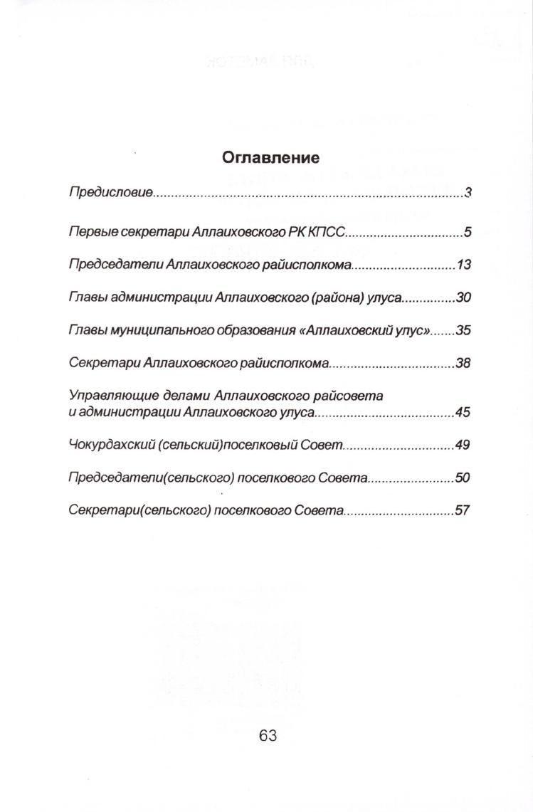 Руководители Аллаиховского улуса 1931-2004 гг : (биографический справочник) / Муниципальное образование "Аллаиховский улус", Аллаиховский улусный архив ; [составители: Докунаева А. А., Иванова М. И, Протопопова С. Н.]. - Якутск : [б. и.], 2005. - 64 с.