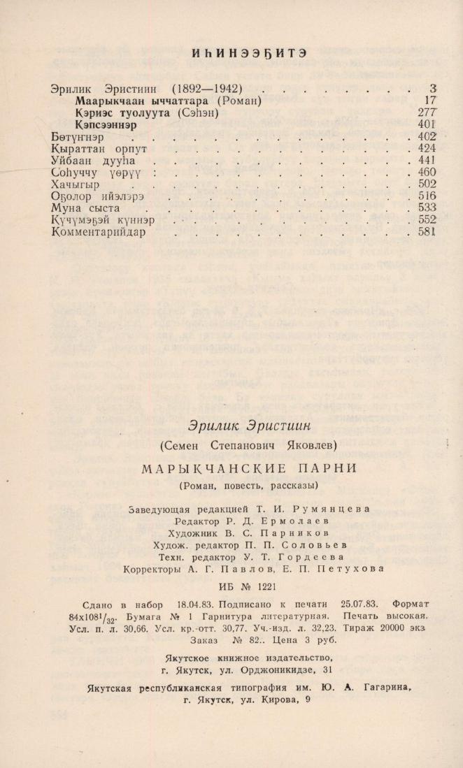 Маарыкчаан ыччаттара ; Кэриэс туолуута ; Кэпсээннэр : [роман, сэһэн, кэпсээннэр] / Эрилик Эристиин ; [В. С. Парников ойуута]. - Дьокуускай : Кинигэ издательствота, 1983. - 582, [1] с.