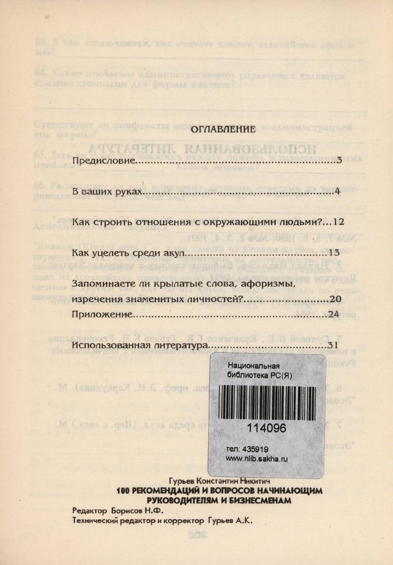 100 рекомендаций и вопросов начинающим руководителям и бизнесменам / К. Н. Гурьев ; автор предисловия Н. Ф. Борисов. - Якутск : [б. и.], 1995. - 31 с.