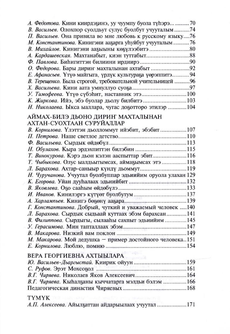 Үйэлэргэ умнуллубат үтүөлээх учуутал / [хомуйан оҥордулар: Л. И. Барахова, Е. А. Корнилова ; эрэдээктэр А. П. Алексеева ; аан тыл Ф. В. Габышева]. - Дьокуускай : Компания "Дани-Алмас", 2016. - 174, [2] c., [8] л. ил., портр.