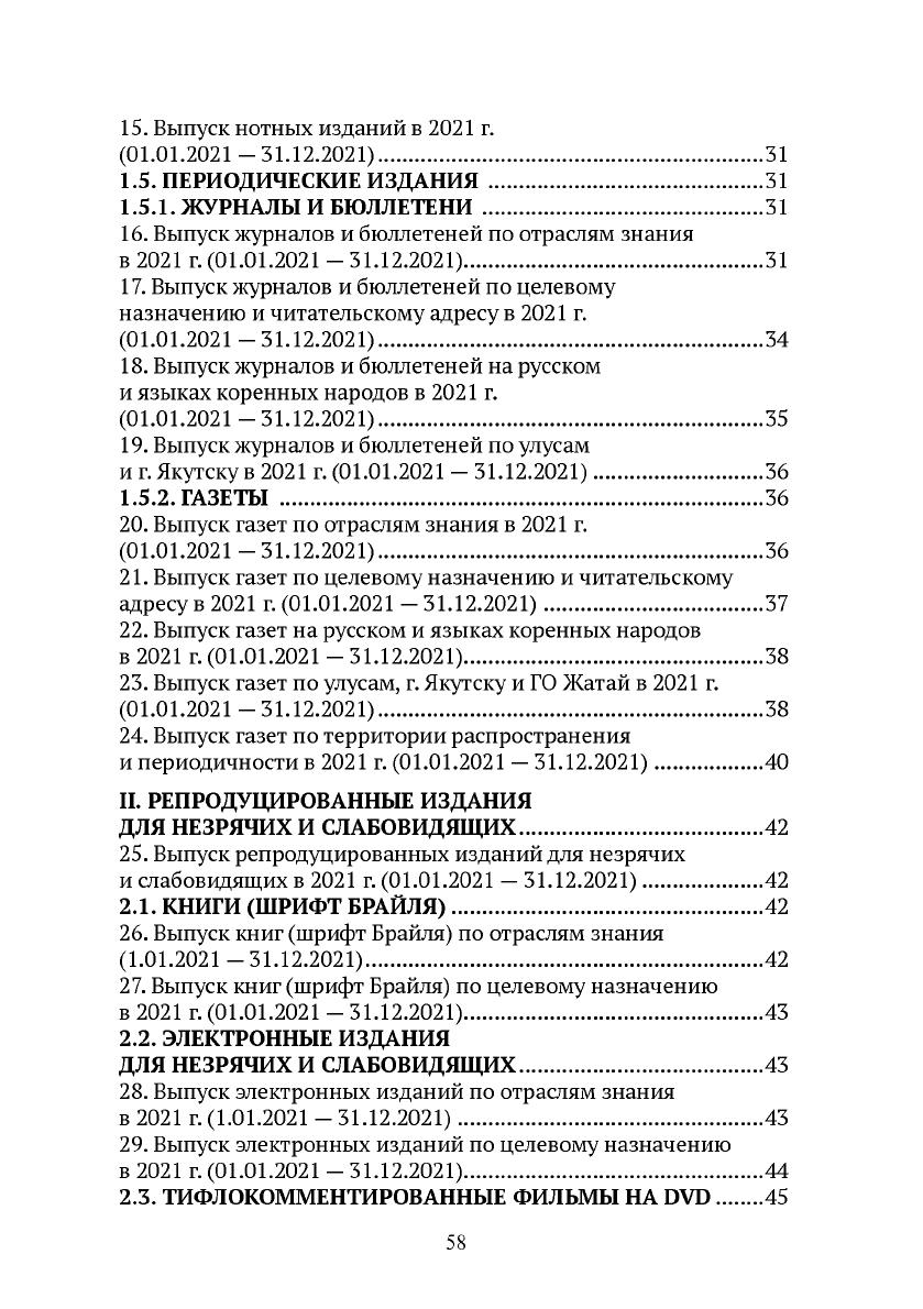 Печать Республики Саха (Якутия) : статистический сборник = Саха сирин бэчээтэ : статистика хомуурунньуга / Министерство культуры и духовного развития Республики Саха (Якутия), Национальная библиотека Республики Саха (Якутия), Республиканская библиотека для слепых, Национальный центр аудиовизуального наследия народов Республики Саха (Якутия) им. И. С. Жараева. - Электрон. дан. - Якутск : РИЦ НИЦ НБ РС(Я), 2020- . 2021. - 2023. - 1 файл (58, [1] с.; 1,94 Мб).
