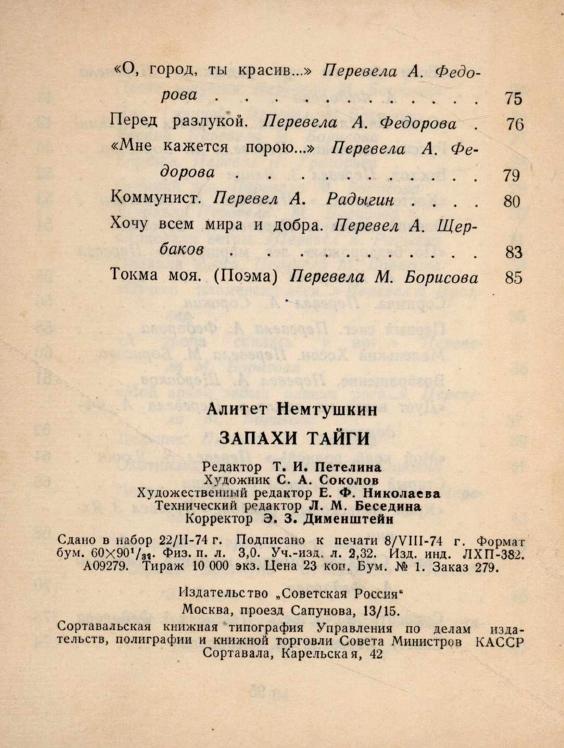 Запахи тайги : стихи и поэма : перевод с эвенкийского / Алитет Немтушкин. - Москва : Советская Россия, 1974. - 95, [1] с.