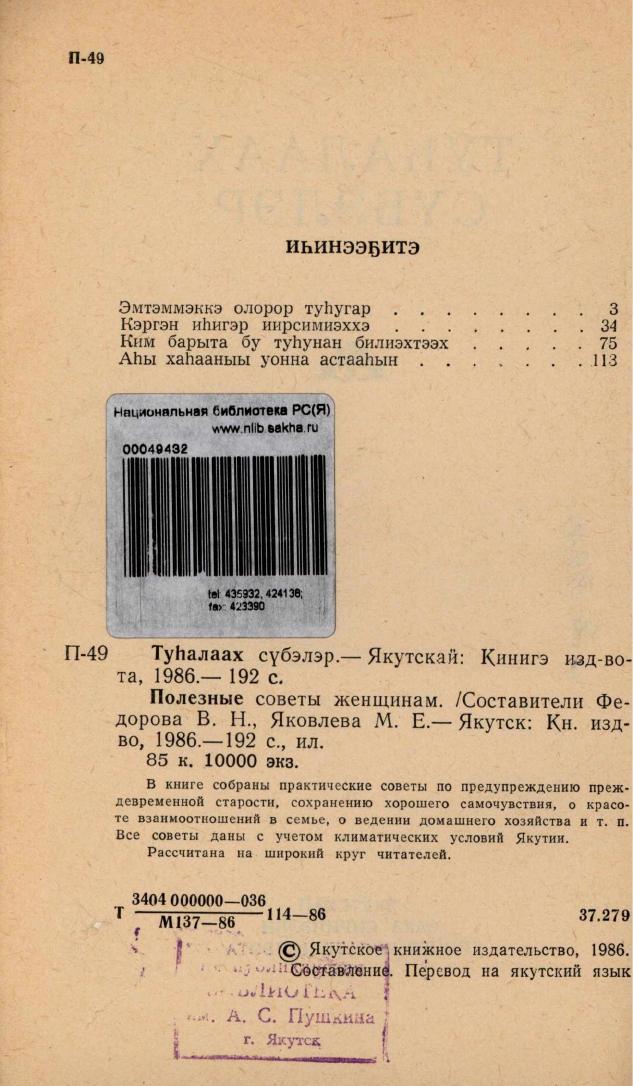 Туһалаах сүбэлэр / [хомуйан оҥордулар : Федорова В. Н., Яковлева М. Е.]. - Якутскай : Саха сиринээҕи кинигэ издательствота, 1986. - 191, [1] с.