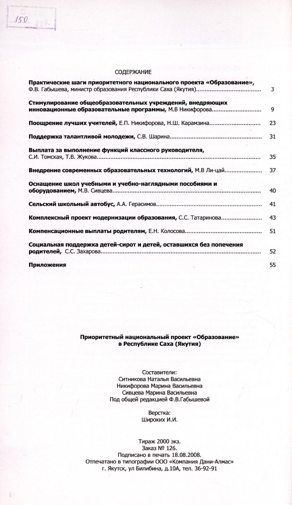 Приоритетный национальный проект "Образование" в Республике Саха (Якутия) / Министерство образования Республики Саха (Якутия) ; [составители: Н. В. Ситникова, М. В. Никифорова, М. В. Сивцева ; под общей редакцией Ф. В. Габышевой]. - Якутск : Компания "Дани Алмас", 2008. - 77, [1] с.