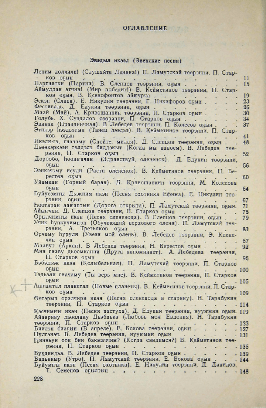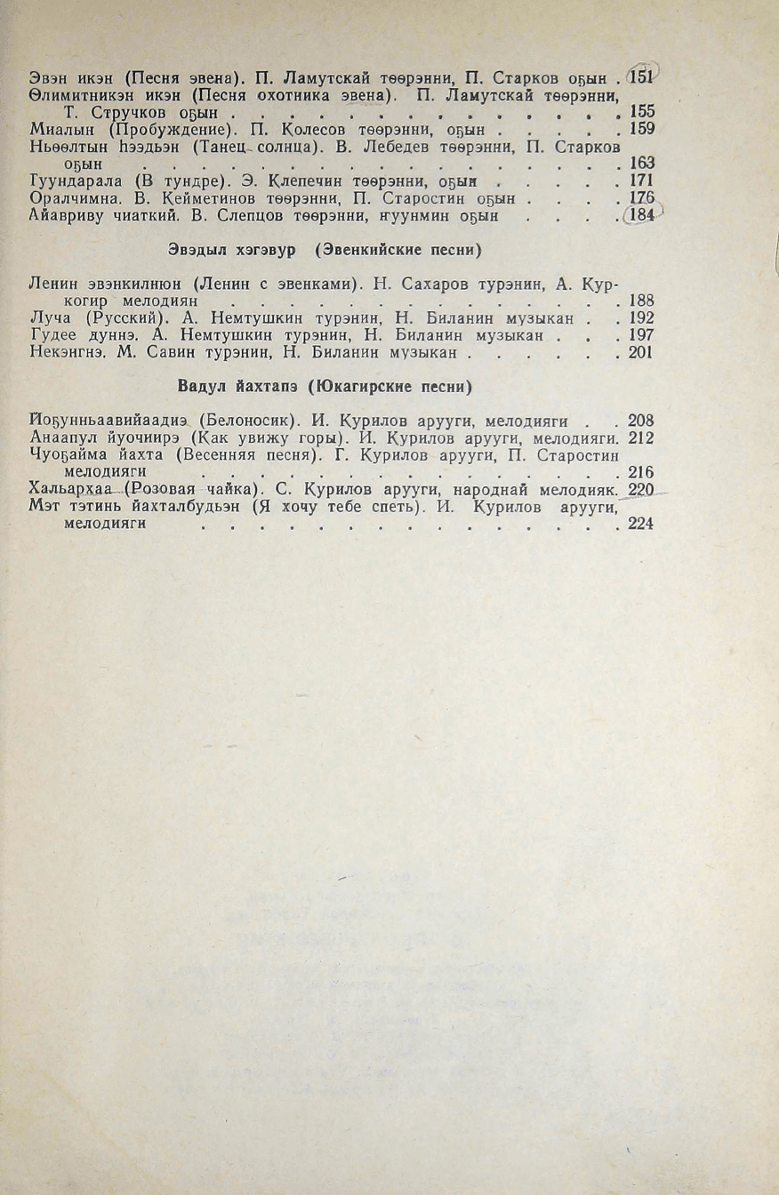 Песни оленьего края [[Ноты]] : [песенник / сост.: П. Н. Старков, Н. С. Толбонова ; сахалыы көҥүл тылб. Василий Сивцев, нуччалыы подстроч. тылб. С. Лебедкин оҥордулар]. - Якутскай : Саха сиринээҕи кинигэ изд-вота, 1987. - 228, [1] с.