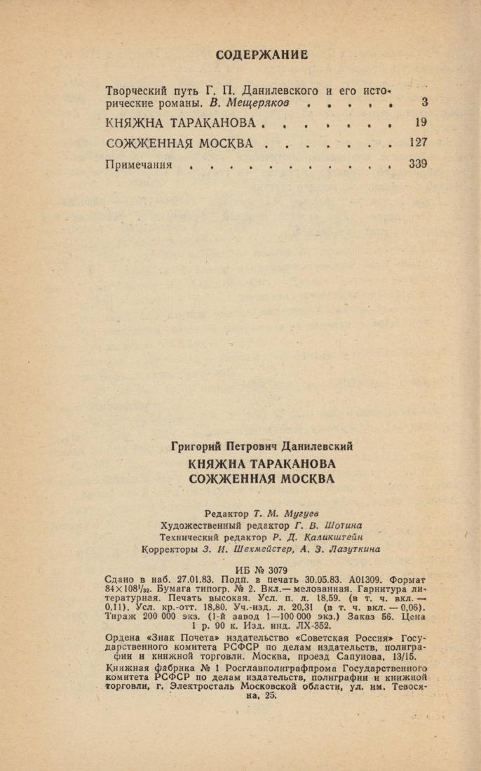 Княжна Тараканова ; Сожженная Москва : исторические романы / Г. П. Данилевский ; составитель, автор вступительной статьи и примечаний В. П. Мещеряков ; художник А. В. Денисов. - Москва : Советская Россия, 1983. - 350, [2] с.