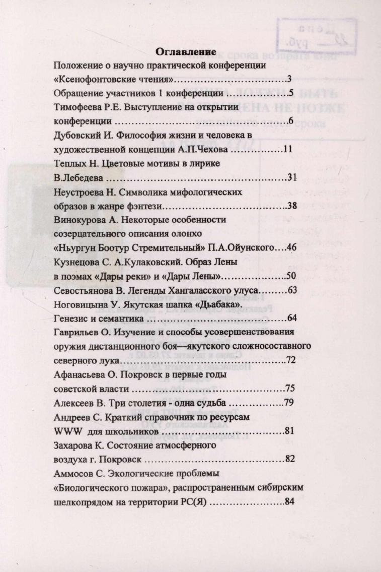 I Ксенофонтовские чтения (2001 г.) / Покровская улусная многопрофильная гимназия ; [редакторы: Скрябина К. Г., Ефимова Л. И.]. - Покровск : типография ЦИТ и РИД Хангаласский УУО, 2002. - 86, [2] с.