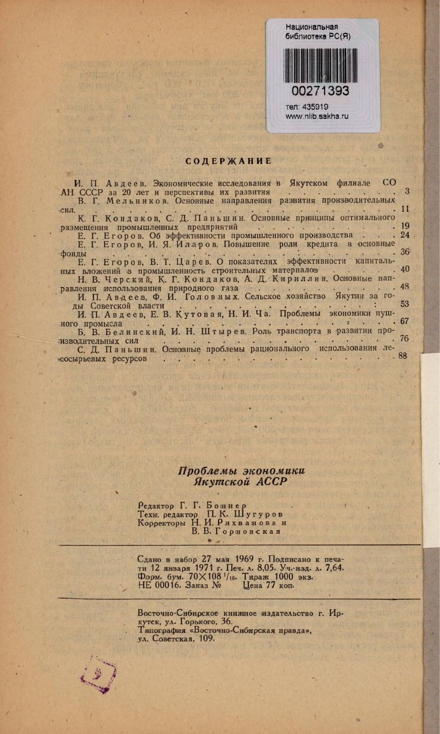 Проблемы экономики Якутской АССР / Академия наук СССР, Сибирское отделение, Якутский филиал, Отдел экономики ; редколлегия: П. П. Авдеев (ответственный редактор), Б. В. Белинский, В. Г. Егоров, И. Н. Штырев. - Иркутск : Восточно-сибирское книжное издательство, 1971. - 90, [2] с.