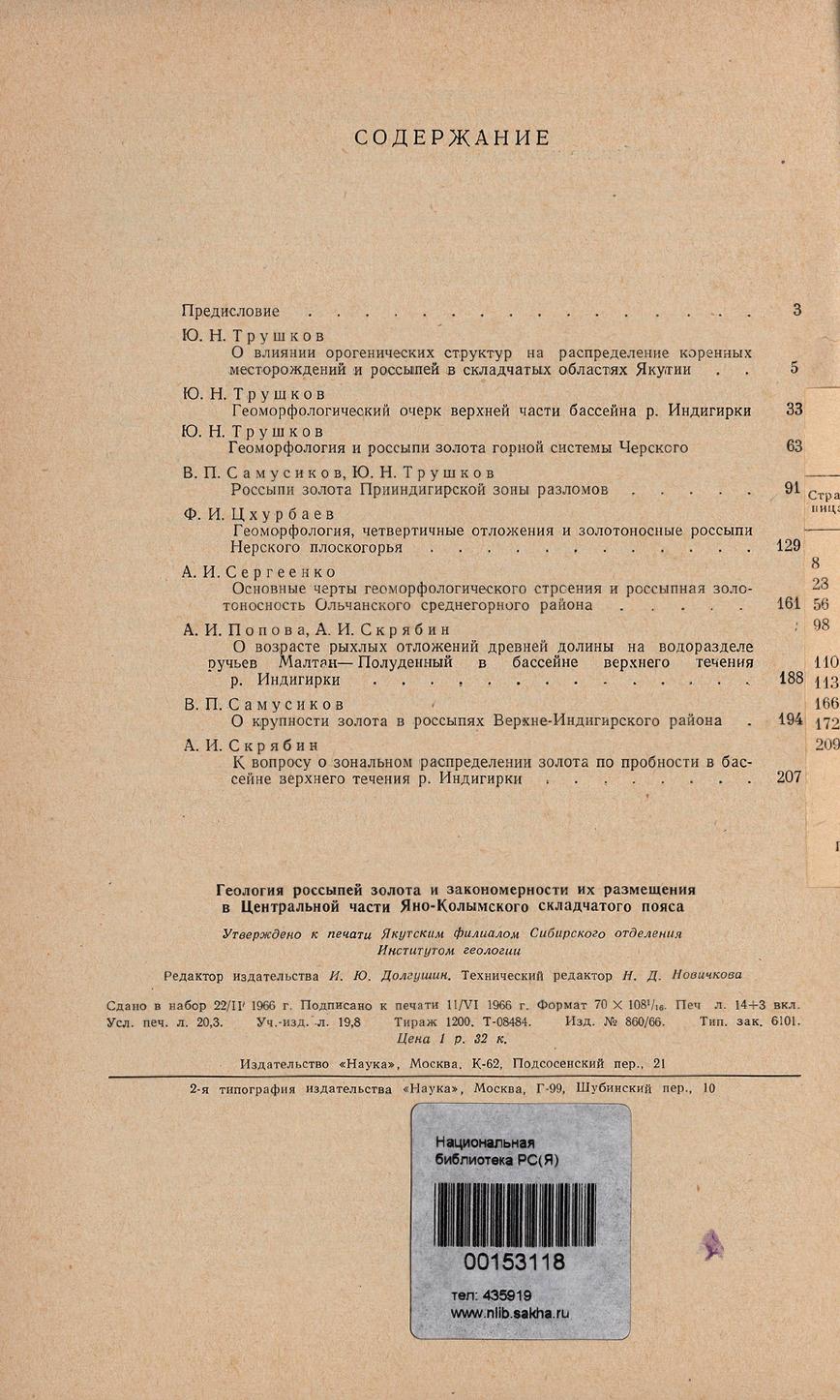 Настоящий сборник посвящен геологии россыпей и закономерностям их размещения в складчатых областях Якутии. В сборнике освещается также ряд общих вопросов по закономерностям распределения россыпей и условиям их формирования и приведены результаты исследований по отдельным, наиболее интересным районам россыпной золотоносности. Материалами для сборника послужили исследования, которые проводились в последние годы Якутским филиалом Сибирского отделения АН СССР под руководством член-корреспондента АН И. С. Рожкова