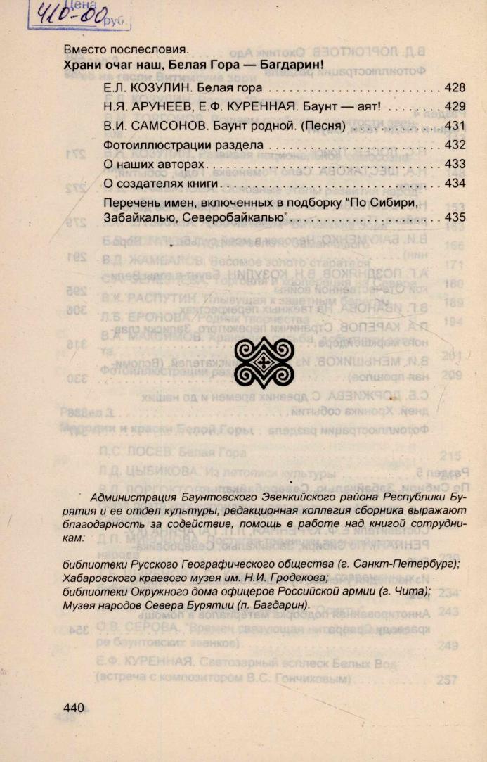 Судьба моя, Баунт : сборник документальной и художественной публицистики / Администрация Баунтовского Эвенкийского района Республики Бурятия [и др. ; ед.-сост. Е. Ф. Куренная]. - Чита : [б.и.], 1997. - 440 с.