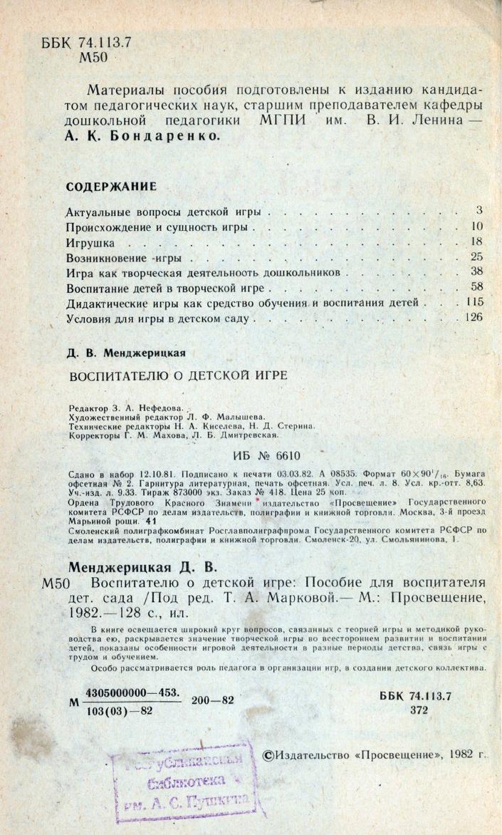 В. Воспитателю о детской игре : Пособие для воспитателя детского сада / Под ред. Т.А.Марковой. - М : Просвещение, 1982. - 128 с.