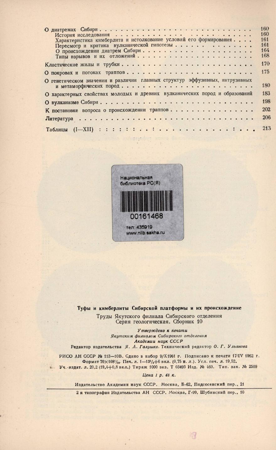 Туфы и кимберлиты Сибирской платформы и их происхождение / А. А. Меняйлов ; ответственный редактор О. А. Воробьева. - Москва : Издательство Академии наук СССР, 1962. - 227 с. : ил., табл., карт. - (Труды Якутского филиала Сибирского отделения АН СССР. Серия